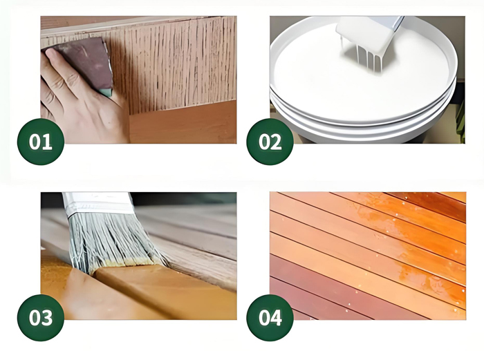 सतह की तैयारी: लकड़ी साफ, सूखी, मजबूत और दूषित पदार्थों (धूल, ग्रीस, पुराना परतदार पेंट/वार्निश) से मुक्त होनी चाहिए। आसंजन के लिए सैंडिंग आमतौर पर आवश्यक है। प्राइमर की अक्सर आवश्यकता होती है (निर्माता-निर्दिष्ट प्राइमर का उपयोग करें)।
